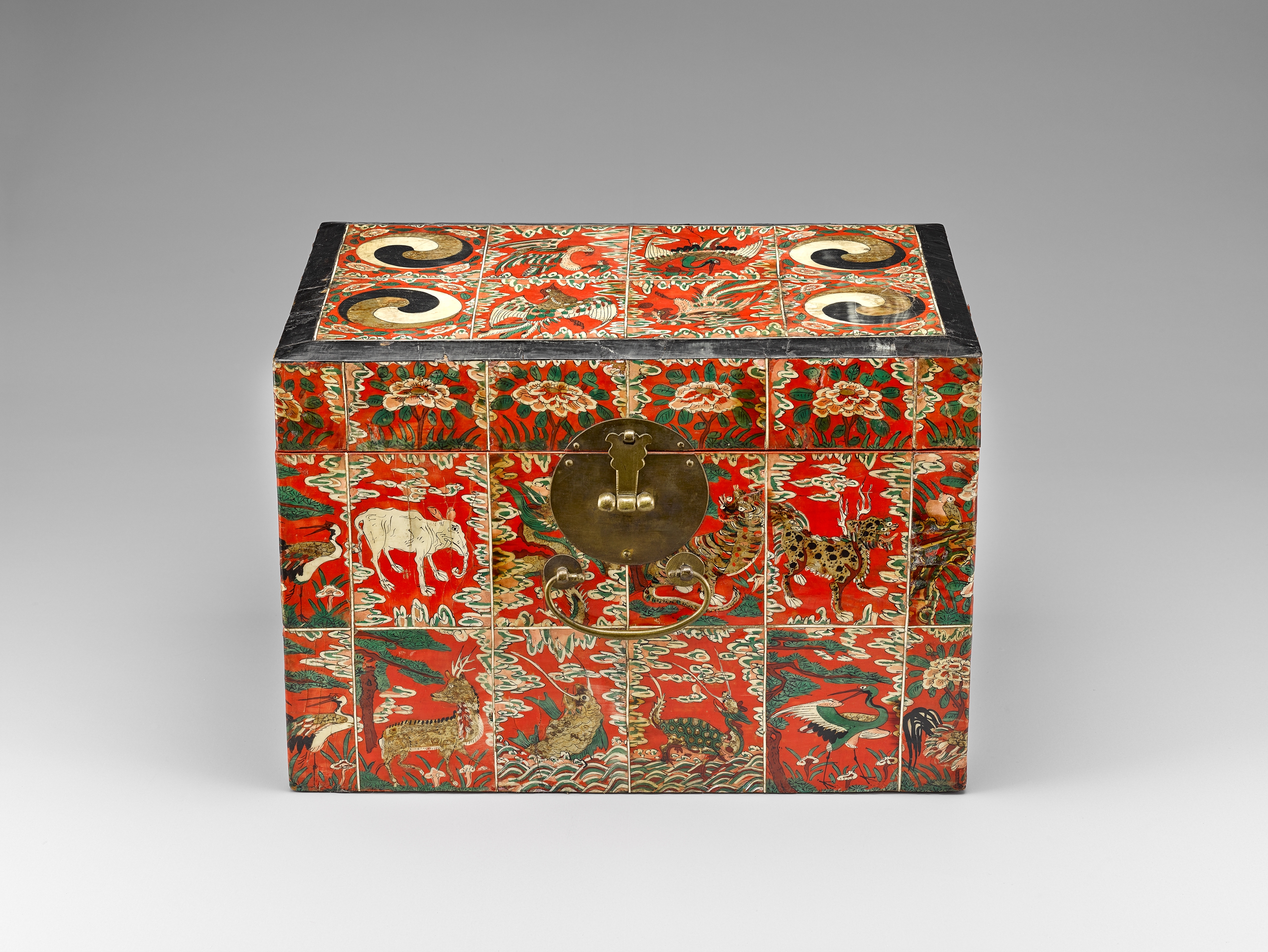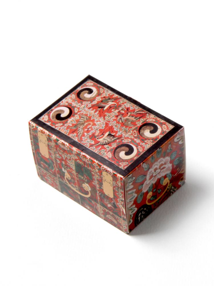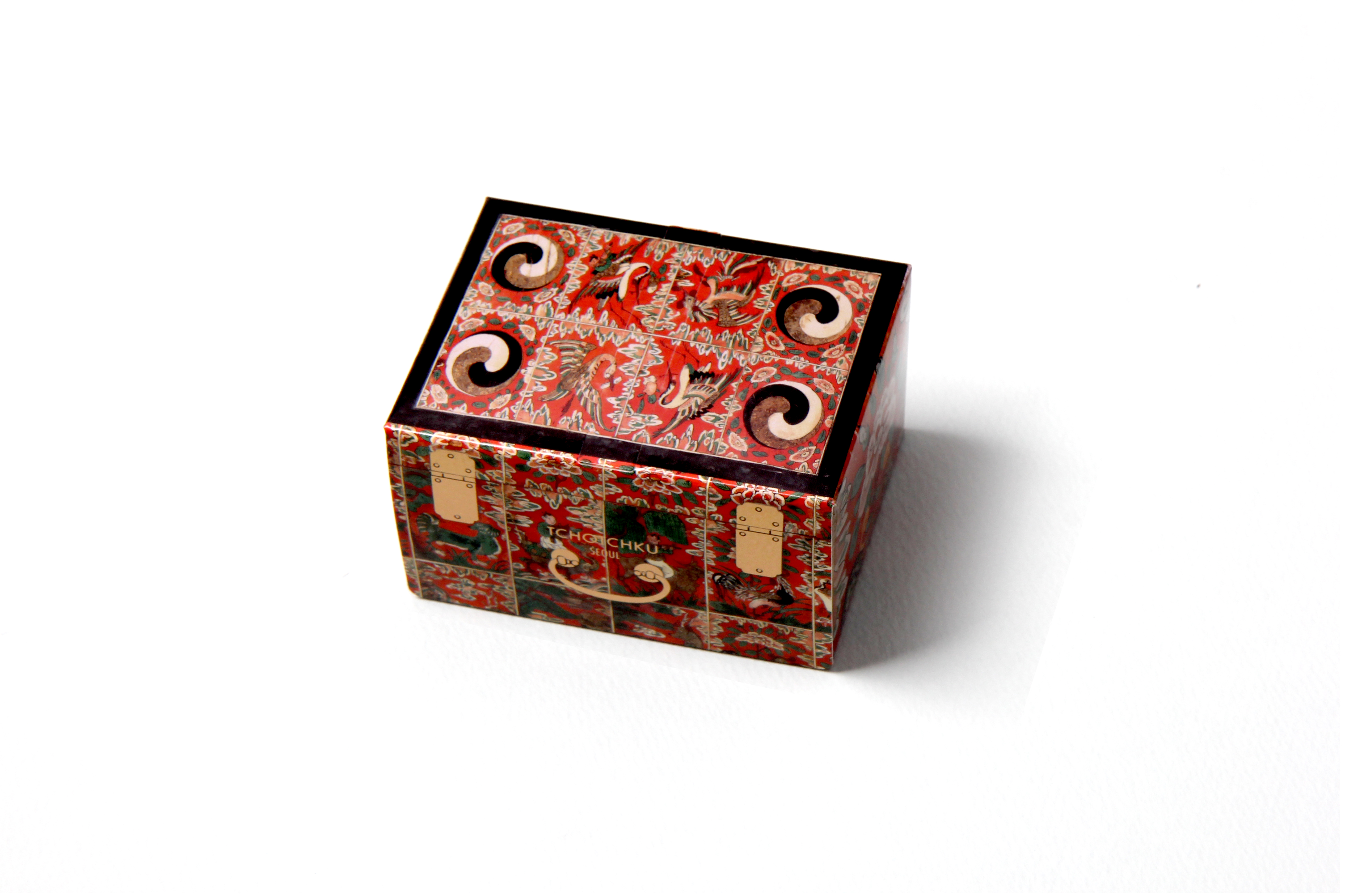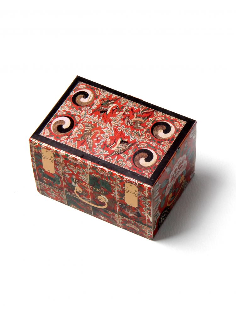붉은 주칠을 하고 꽃과 태극무늬 동자 등 여러 가지 모티브로 아름답게 제작된 화각함을 활용하여 디자인했습니다.